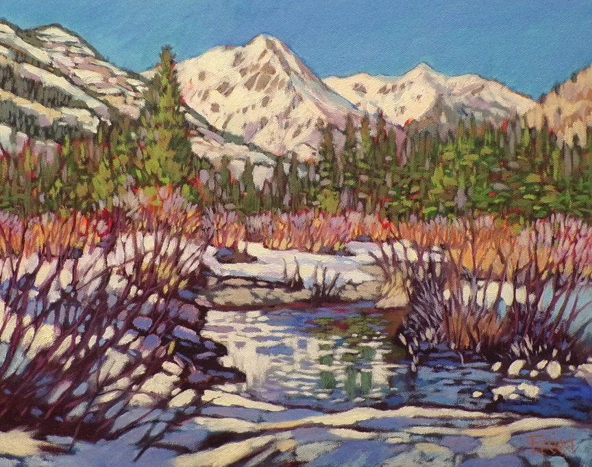 This wintery backcountry landscape represents a historic bike ride for me. I love mountain biking, but the trails I ride during the warm season near my home town of Crested Butte Colorado typically become inaccessible by late October. At best, I can sometimes squeeze in one last ride during the month of November. This past year, my bike riding season was extended by warmer than usual weather. The painting you see here was inspired by a photograph recorded during a bike ride on the Lower Loop during the second week of December!